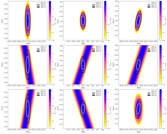 Furthermore, based on the WCD uncertainty results, the observed Fisher information performance and its low sensitivity to sampling suggest that classical variance–covariance propagation approaches are reliable except for certain challenging scenarios. These include high flight altitudes, low-quality camera pose measurements, and viewing geometries with non co-planar FoVs ( case). These viewing geometries are more prevalent in frame imagery since the spatial footprint in frame imagery is rectangular, thus establishing the likelihood ratio statistic as a potential tool for robust uncertainty estimation in such scenarios.