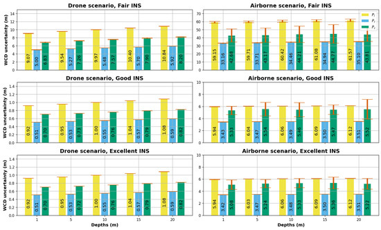 In Figure 15, we display the depth-averaged WAI uncertainties, together with their corresponding standard deviations, spanning viewing geometries, INS classes, and sample sizes for both drone and airborne settings. It is often the case that the variability of WAI uncertainty with depth, as indicated by error bars, is more pronounced in difficult scenarios (10 samples). For the WAI height inference, the viewing geometry showed the best performance overall, suggesting that cross lines are strongly relevant in pushbroom acquisitions if one is interested in inferring the WAI height. It is particularly noteworthy that the achieved WAI height 95% CI of 17 cm and 19 cm for the excellent and good INS, respectively, closely aligns with the Global Navigation Satellite System (GNSS) precision of 5 cm when considering a substantial sample size of . This suggests that with relatively small high resolution datasets, drone-based acquisitions can provide significantly accurate estimations of the WAI height in optically clear shallow waters with a textured seabed. Furthermore, considering the decline in uncertainties by a factor of with increasing sample size, even with the fair INS quality, we extrapolate that drone flights could achieve a WAI height precision of 16 cm given a sample size of about 1 million. Although 1 million matched feature points may seem substantial for a single survey of pushbroom imagery in coastal areas, given constraints like water clarity and a textured seabed, this number of points is easily attainable with high-resolution frame video imagery under optimal conditions. This emphasizes the efficiency of drone-based acquisitions even with less-than-ideal INS quality, given an adequately large dataset of paired feature points.