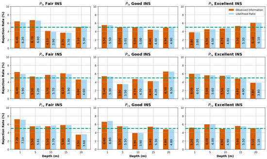 Specifically, for the fair INS scenario, the rejection rates for the test statistic exceeded 15% at point , while the r statistic demonstrated relatively consistent rejection rates across different points (3.5–7%). Given the WCD uncertainty results of , highlighted in the previous section, we can infer that the higher variability in the WCD uncertainty estimates for in the previous subsection is consistent with the observed rejection rates. These findings suggest that the -based CI may overestimate the WCD uncertainty in high-altitude scenarios. This is particularly the case for viewing geometries similar to , with a 19% rejection rate for the most noisy attitude scenario. On the other hand, the r statistic showed greater effectiveness in estimating the WCD uncertainties in this particular case ( and airborne fair INS).
