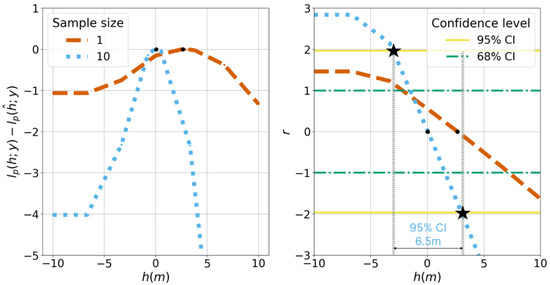 Drone and excellent INS scenario: WAI height inference based on likelihood profiling for 1 and 10 samples. The graphic on the left represents the normalized profile likelihood on the y-axis according to the WAI height on the x-axis. The graphic on the right represents the r statistic on the y-axis according to the WAI height on the x-axis. The black points correspond to the WAI height MLE . Additionally, on the right side, the 95% CI for 10 samples are indicated as the width between the intersections (marked by black stars) of the r statistic curve and the 95% confidence critical values .