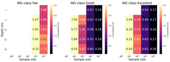 Figure 14 presents heatmaps of WAI height uncertainties, determined by the r CI for point across different INS classes for the drone scenario. These heatmaps account for a variety of depths and sample sizes. As the sample sizes increased, so did the statistical information, leading to more precise profile likelihoods and subsequently smaller uncertainties in the WAI height. Interestingly, a trend of uncertainty decreasing by a factor between 3 and was noted. This pattern, where uncertainty contracts in relation to the square root of the sample size (), echoes the square root law common in Gaussian errors and is linked to the central limit theorem’s principle of sample averages approaching a normal distribution as the sample size expands, leading to decreased uncertainty. Analogously to the WCD inference, the good and excellent INS demonstrated similar performances. Intriguingly, the depth has no major impact on the WAI uncertainties except for the observed lag of the 1 m depth scenario with sample size compared to other depths. This insinuates that the task of WAI inference tends to be more difficult when it relies on observations taken at depths near the WAI surface.