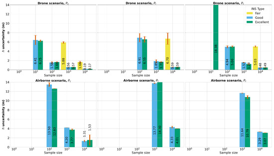 Depth-averaged WAI height uncertainty across different INS types and sample sizes for each point, as reported by the r statistic confidence intervals. Missing bars correspond to non-identifiable 95% confidence intervals for all the averaged depths. The numerical values displayed on each bar correspond to the depth-averaged WAI height visually represented. The error bars represent the standard deviation of WAI height uncertainty across the different depths.