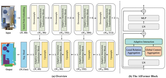 To address this problem, we propose the Adaptive Interaction Transformer. As shown in Figure 1a, our network architecture utilizes a U-Net structure with skip connections, which contains four levels of encoders and decoders. Specifically, before the Encoder, the Initial Point Embedding layer is used to embed the local information of the raw points. Then, the backbone is stacked by a Downsample or Upsample block and several AIFormer Blocks. The Downsample or Upsample block provides a reference point set, while the AIFormer Block processes and fuses local and global semantic features of the points in an adaptive interaction manner. Following the backbone, the Segmentation Head (Seg. Head) block predicts the category label of each point. Detailed parameters of the model architecture are described in Section 4.2. In the next subsections, we introduce the modules of the AIFormer Block in detail.