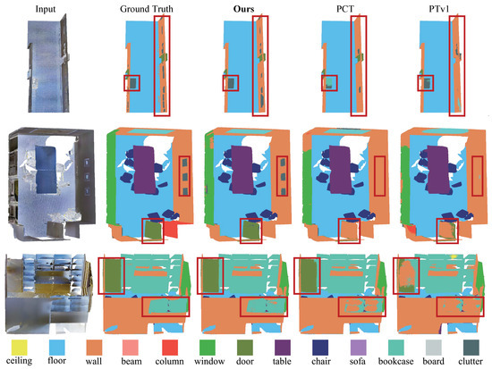 Visual comparison of our model with other methods [15,16] on S3DIS. Differences in semantic segmentation results are highlighted using red box for clarity.