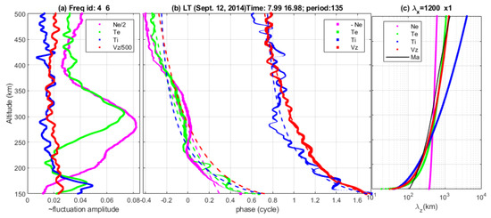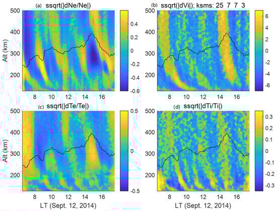 ) for 12 September 2014. Although data on the molecular ion fraction are available, they do not have the time resolution and altitude coverage for TID studies. The independent time and height resolution values are 15 min and 18 km, respectively. The minimum