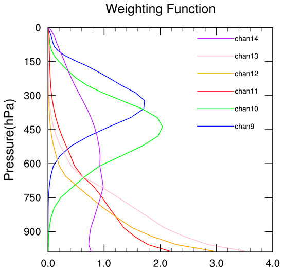 The level 1 radiance data and the corresponding GEO data for AGRI onboard FY-4A are used for assimilation, with 4 km spatial resolution every 15 min. FY-4A/AGRI has 14 spectral bands ranging from visible to long-wave infrared, with two water vapor channels centered at 6.25 and 7.1 µm, respectively [27]. These two channels mainly provide information on moisture at middle and high levels of the atmosphere, which is important for typhoon simulation. In Figure 1, it also can be seen that the weighting function peaks of the two channels are located around 350 hPa and 400 hPa, while channels 11–13 are near the ground and channel 14’s peak is at 750 hPa. Following the previous studies, two water vapor channels, channels 9–10, are applied in the assimilation experiments. Additionally, when AGRI radiance data are introduced in assimilation experiments, a thinning mesh of 60 km is adopted.
