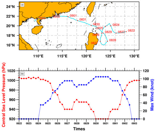 According to the Japan Meteorological Agency (JMA) record (Figure 2), Saola formed as a tropical depression over the western North Pacific on 22 August 2023. In the following five days, it moved westwards slowly and cycled around over the seas east of Luzon (Figure 2a). Its intensity increased rapidly during this period, with a maximum wind (MW) of 95 knots and a central sea level pressure (CSLP) of 940 hPa at 1800 UTC on 26 August (Figure 2b). It then continued to move westwards and entered the South China Sea. On August 30, it intensified to a super typhoon, with an MW of 105 knots and a CSLP of 920 hPa. Afterward, it gradually approached the coast of Guangdong and made landfall on September 2. Because of the frictional consumption, it weakened continuously and disappeared at 1200 UTC on 3 September in the sea around Guangdong.