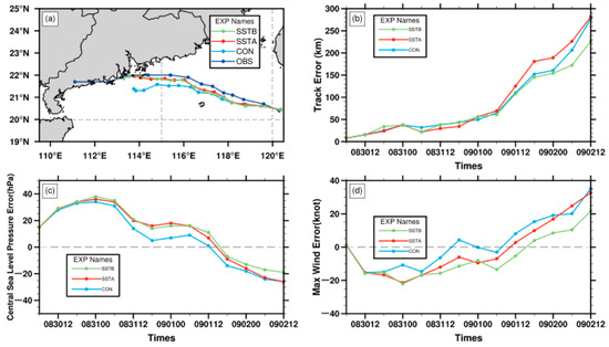 Compared to the track forecast, Figure 4c,d show that all experiments underestimate the intensity of Typhoon Saola when the typhoon is on the sea. During this period, SSTA and SSTB obtain a lager intensity error than CON. But, because of the better track forecast in the final 24 h forecast, the intensity forecast from SSTA and SSTB, not only the central sea level pressure (Figure 4c) but also the maximum wind speed (Figure 4d), is smaller than CON, especially for SSTB.