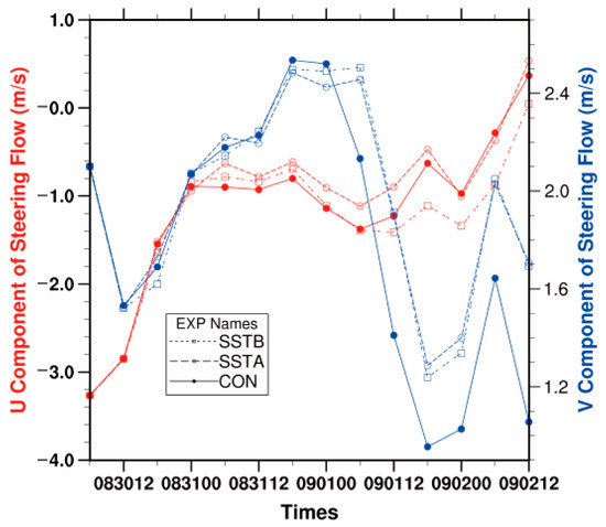 The northwestward movement reason can be seen in Figure 5. Following the method described by Zhang et al. (2020) [44], the steering flow is calculated based on winds from 700 to 200 hPa within 3°–5° from the typhoon’s center. The steering flow for all experiments is a southeasterly wind with a positive V component and a negative U component, which guides Typhoon Saola to move to Guangdong province. After 0000 UTC on 1 September, CON’s V component decreases rapidly and is smaller than in other experiments, which leads to the termination of northward movement. Its U component decreases too, which slows down the speed of moving westward. Combined with the influence of SST (Figure 3), CON’s typhoon moves westward to the high SST area instead of northwestward at a slower speed. In the SST replacement experiments, SSTA has a similar large V component as SSTB, which steers the typhoon further northward. But, SSTA obtains a smaller U component than SSTB and CON, which decelerates the typhoon and obtains the larger track error in the final forecast time as same as Figure 4b.