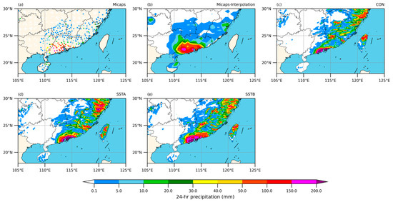 The 24 h accumulated precipitation (units: mm) from 1200 UTC 1 September to 1200 UTC 2 September 2023 of (a) the Micaps observation; (b) the interpolated Micaps observation with a horizontal resolution of 0.5° × 0.5°; (c) CON; (d) SSTA; and (e) SSTB. The dots with different colors in (a) represent different accumulated precipitation, as shown in the color bar.