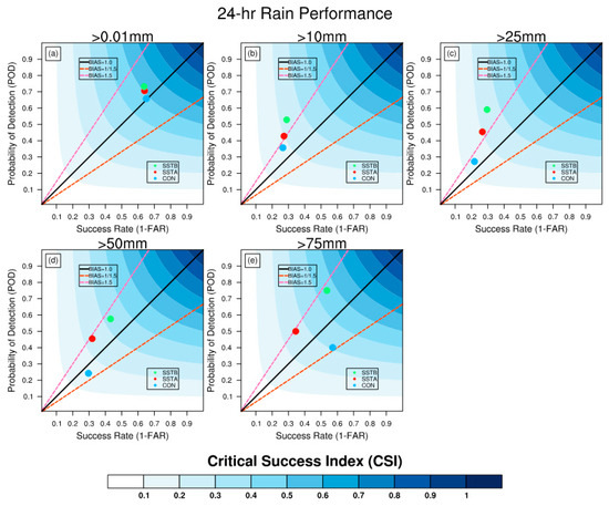 Performance diagram for the 24 h accumulated precipitation for the CON (light blue), SSTA (red), and SSTB (light green) with a threshold of (a) 0.01 mm; (b) 10 mm; (c) 25 mm; (d) 50 mm; and (e) 75 mm from 1200 UTC 1 September to 1200 UTC 2 September 2023.