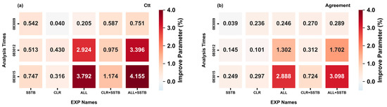Figure 9 presents the IPs in CTTs and agreements on sky conditions for individual experiments. Generally, the results of CTTs (Figure 9a) are consistent with the agreements on sky conditions (Figure 9b), but the value for is generally larger than the corresponding . It can be seen that the IPs in Figure 9 are all positive, with values increasing over time for most experiments. This suggests that the clouds are better analyzed by utilizing AGRI SST data to modify boundary conditions or assimilating AGRI radiances to modify initial conditions. And, the improvements become more pronounced as time progresses. Comparing CLR and ALL with CLR + SSTB and ALL + SSTB, it can be found that experiments with changed SST perform better in CTT and sky conditions analyses. And, SSTB also has advantages over CON. This suggests that the application of AGRI SST data as WRF ocean boundary conditions can better improve simulations of clouds. In addition, compared with experiments only assimilating clear-sky radiances (CLR and CLR + SSTB), all-sky radiance assimilation leads to greater improvements (ALL and ALL + SSTB), indicating that assimilating more radiances in cloudy regions is beneficial for cloud simulation. Above all, it is clear that the combination application of FY-4 SST and radiance products can significantly improve the analysis filed.