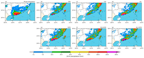 The same as Figure 7 but for (a) the interpolated Micaps observation with a horizontal resolution of 0.5° × 0.5°; (b) CON; (c) CLR; (d) ALL; (e) SSTB; (f) CLR + SSTB; and (g) ALL + SSTB.