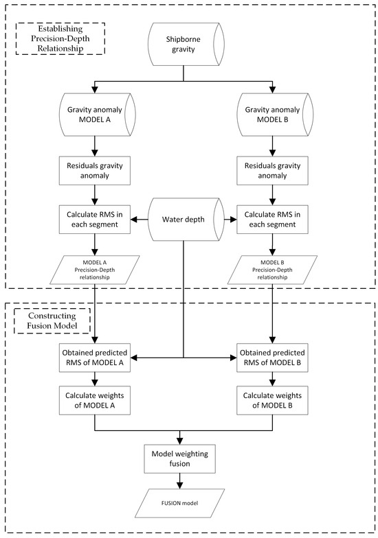 This section presents a new fusion method to combine the advantages of gravity field models obtained using the two inversion methods. The complete process is shown in Figure 1: Firstly, the residuals of the gravity field models are calculated according to shipborne gravity data in the investigated area. The root mean square (RMS) of the residuals in each segment is calculated after the water depth has been segmented, then the Precision–Depth relationship is established. Secondly, according to the Precision–Depth relationship, the predicted precision at each grid point in the whole study area can be obtained based on the water depth. Then, the FUSION gravity anomaly model can be constructed by model weighted fusion.