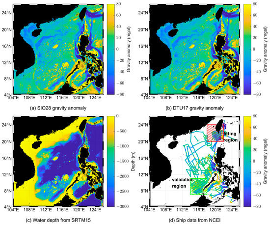 Data used in this study are freely available as follows: SRTM15+V2.4 and SIO28 computed by the Scripps Institution of Oceanography are available on https://topex.ucsd.edu/pub, accessed on 5 October 2024. DTU17 published by Denmark Technical University is accessible at https://ftp.space.dtu.dk/pub, accessed on 5 October 2024. Shipborne gravity data https://www.ncei.noaa.gov/maps/trackline-geophysics/, accessed on 5 October 2024. Trackline Geophysical Data provided by National Centers for Environmental Information is accessible at https://www.ncei.noaa.gov/maps/trackline-geophysics/, accessed on 5 October 2024.