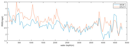 In order to establish the Precision–Depth relationship between the gravity field model precision and water depth, the RMS of the residuals between the two gravity field models and the shipborne gravity in the waters near Taiwan Island (118~122°E, 20~24°N) was counted according to the depth segment. The deepest water depth of the region used to establish the relationship in this study is 4865 m. In this study, considering the range of water depth and data volume in each segment, the interval step was set to 48.65 m. Then, the RMS corresponding to the SIO28 and DTU17 gravity field models in each water depth segment was calculated by Equations (1)–(3). The Precision–Depth relationship of SIO28 and DTU17 models established in the Taiwan area is shown in Figure 3.