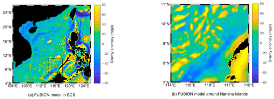 Marine gravity field FUSION model. (a) FUSION model over SCS; (b) FUSION model around Nansha Islands.