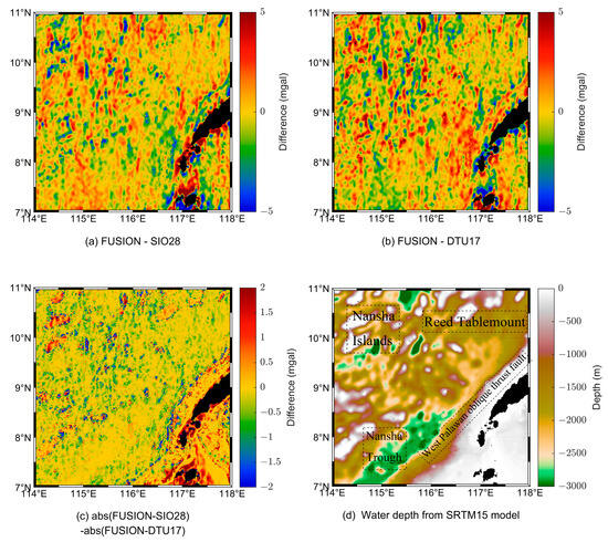 Comparison near Nansha Islands; (a) the difference between FUSION and SIO28; (b) the difference between FUSION and DTU17; (c) the difference between the absolute values of the differences between the fusion model and the two original models; (d) the SRTM15 water depth model.