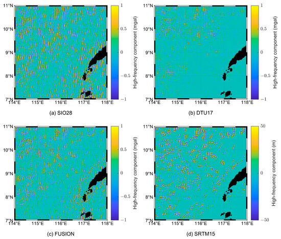 Comparison of high-frequency components from different models. (a) High-frequency components of gravity anomaly from SIO28 model; (b) high-frequency components of gravity anomaly from DTU17 model; (c) high-frequency components of gravity anomaly from FUSION model; (d) high-frequency components of water depth from SRTM15 model.