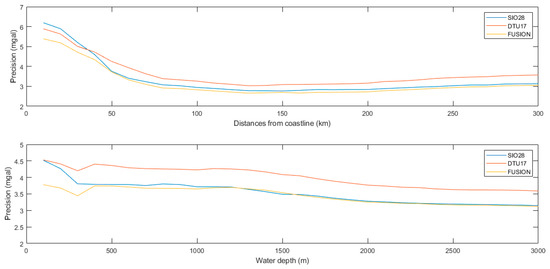 The precision analysis of different gravity field models: (top) the precision of different gravity field models with distances from the coastline, and (bottom) the precision of different gravity field models with water depths.