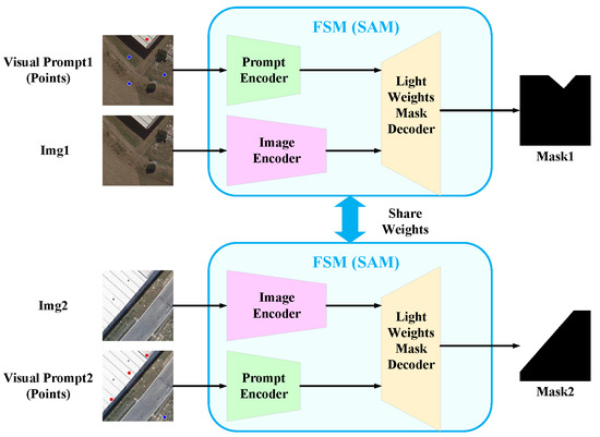The core component of this module is FSM, whose main function is to receive the visual prompt of multitemporal images generated by the “Semantic Align Module” and segment the CRoI masks in the multitemporal images through the foundation segmentation model of shared weights. As mentioned earlier, classic FSMs, include the the segment anything model (SAM) [66]. Although the segmentation results of FSMs represented by the SAM do not carry semantic information, it is provided by the Semantic Align Module for guidance; therefore, when the Semantic Align Module is given a visual prompt from a CRoI, an extraction boundary about the CRoI can be generated. Moreover, the SAM can further correct boundaries by providing some visual prompts from the CRoUI as negative samples. Through the CRoI Segment Module, we can obtain more accurate segmentation results for the CRoI text description; therefore, we use SAM as the FSM of this module to introduce this module in detail.