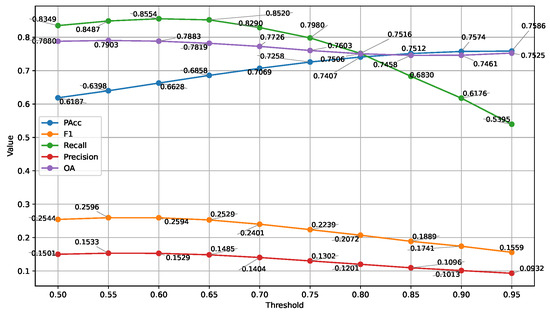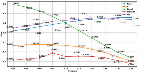 To quantitatively validate the effectiveness of the proposed method, we employed four common accuracy metrics commonly used in CD tasks [33]: precision, recall, F1 score (F1), and overall accuracy (OA). The formulas for these metrics are as follows: