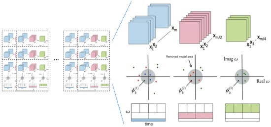 As illustrated in Figure 3, the entire video sequence snapshot is divided into blocks, denoted as , where represents the number of horizontal blocks, and represents the number of vertical blocks. Each block is designed with a certain percentage of overlap with its neighbors. This overlapping strategy serves two main purposes: on one hand, it ensures that the boundary areas of each block are included within adjacent blocks, thereby mitigating boundary effects and enhancing the accuracy of the processing results. On the other hand, it allows for the adjustment of block size and overlap extent according to specific needs, offering flexibility for various application scenarios. For instance, smaller blocks with greater overlap can be employed in areas requiring more detailed analysis, while larger blocks with less overlap can be used in regions with minimal variation. After applying the DMD algorithm to each block, the frequency distribution below the blue snapshot in the obtained graph is indicated, where the low-frequency modality corresponding to the modality within the gray circle, and the high-frequency modality corresponding to the modality outside the circle. After selecting the high-frequency modality for reconstruction, all snapshot numbers are evenly divided into two parts, as shown by the pink snapshots on the right in the figure. The above operations are repeated separately for the generated two parts until the end.