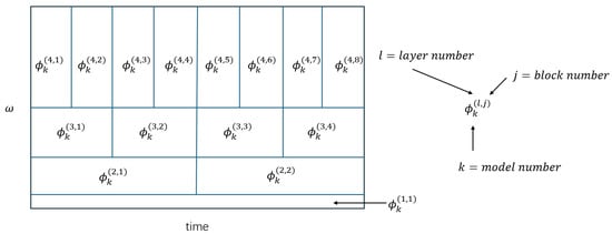 The MDDMD process is detailed as follows. In the MDDMD hierarchy, represents the mode corresponding to the j-th temporal block at the ℓ-th layer. A key advantage of MDDMD over traditional DMD is its capability to decompose data simultaneously along both temporal and frequency dimensions. The MDDMD structure reveals the system’s dynamics across time and frequency. The horizontal axis represents time, with rows in the MDDMD hierarchy indicating the energy distribution of modes across different temporal blocks. The vertical axis denotes frequency, showing the energy distribution of modes at different frequencies within a selected time segment. Each cell in the diagram represents the modal energy within a specific time block and frequency band.