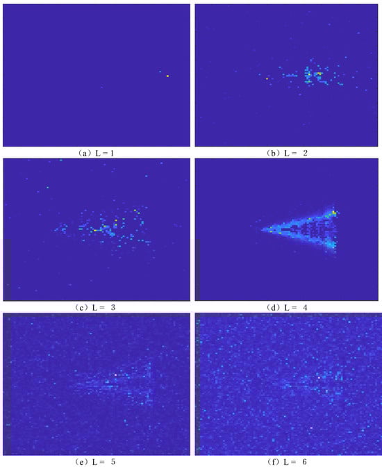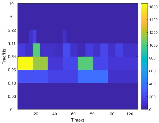 - To highlight the energy of the wake segment, suppress the influence of the sea waves by multiplying the average by the coefficient , resulting in a new energy magnitude asThe obtained represents the energy after suppressing the sea waves. Following step 2, obtain the average distribution of energy across different frequencies for the entire sea surface after suppressing the sea wave frequencies, considered as the main energy distribution of the ship wake at each frequency level l, denoted as with