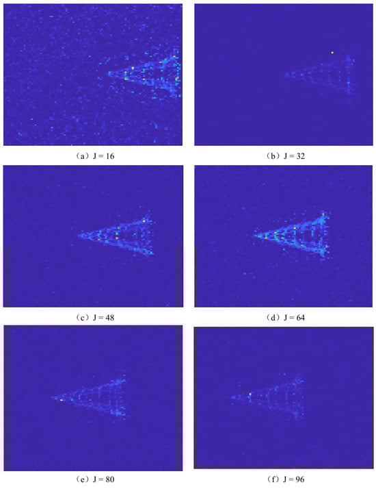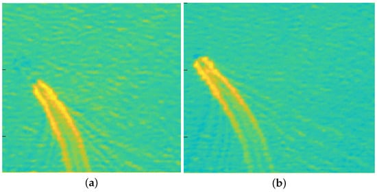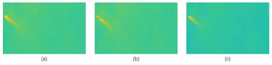 Figure 13a shows that when the block size is too small, the resulting large number of blocks due to the small area of each block inevitably leads to the loss of edge information. This results in an incomplete representation of potential patterns, which is evident in the figure as a loss of detail in the Kelvin wake of the ship. Figure 13b demonstrates that when the block size is too large, it encompasses more noise and irrelevant data, thereby diluting the signal characteristics. In contrast, when the block size is appropriately chosen, as seen in Figure 13c, both the turbulent wake and the Kelvin wake characteristics of the ship are distinctly visible without excessive sea wave noise, allowing for a more pronounced representation of the signal features.