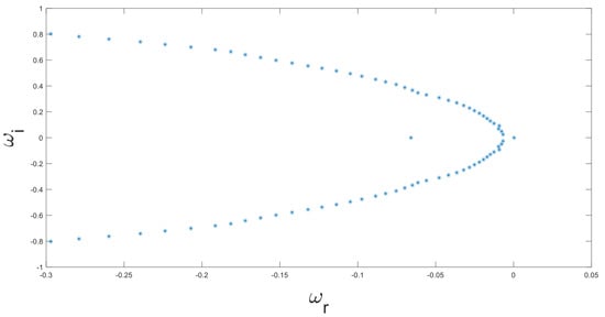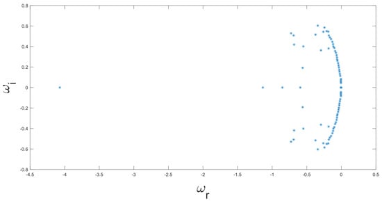From Figure 9 and Figure 10, it can be seen that the frequency is a set of conjugate complex numbers. The part of close to the origin in the figures corresponds to the modes representing the slower changing parts of the video, while the far from the origin corresponds to the modes representing the faster changing parts. The imaginary part of reflects the rate of change of the mode corresponding to that frequency, and the real part indicates the rate of energy decay of the mode. By comparing Figure 9 and Figure 10, it can be observed that the frequency distributions corresponding to the sea wave and wake video sequences are in different frequency bands, and the density in different bands is also different. Therefore, wake detection can be achieved by distinguishing the differences in frequency between sea waves and wakes.