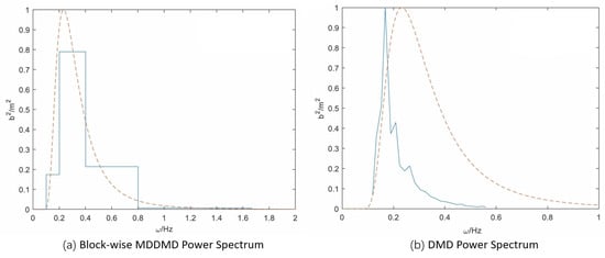 Figure 11 compares the DMD power spectrum, the block-wise MDDMD power spectrum, and the sea wave spectrum. In the left graph, the solid blue line represents the block-wise MDDMD power spectrum for a pure sea surface, while in the right graph, the solid blue line represents the non-block-wise DMD power spectrum for a pure sea surface. The dashed orange lines in both graphs represent the sea wave spectrum for a pure sea surface. It can be seen that both distributions are consistent with the distribution of the sea wave spectrum model. However, the block-wise MDDMD power spectrum of the pure sea surface video sequence is closer to the sea wave spectrum model than the DMD power spectrum, albeit slightly coarser. If the number of blocks is increased, the MDDMD power spectrum would become more refined. Conversely, if the number of blocks is appropriately chosen, MDDMD can provide a more accurate depiction of the power spectrum.