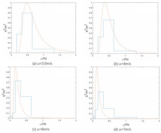 Comparison of wave spectra and MDDMD power spectra under different wind speeds. ((a), (b), (c), and (d) respectively depict the MDDMD power spectrum for a pure sea surface and the sea wave spectrum for a pure sea surface when the wind speed at 10 m above the sea surface is 3.5 m/s, 4 m/s, 6 m/s, and 7 m/s, respectively. In these figures, the blue solid line represents the block-wise MDDMD power spectrum for a pure sea surface, and the orange dashed line represents the sea wave spectrum for a pure sea surface).
