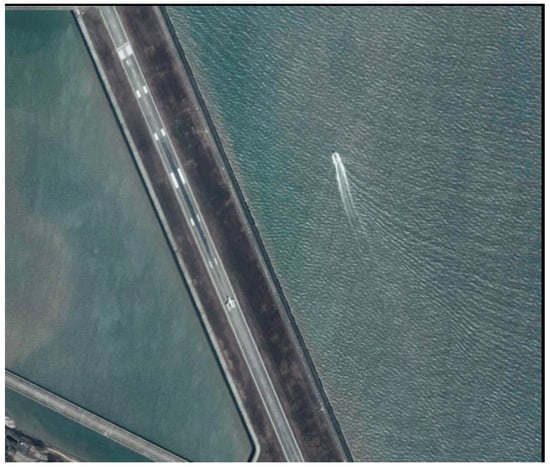 Finally, this paper validates the proposed method using real-world data. Specifically, the video obtained from the Macau Science Satellite website was analyzed. As shown in Figure 14, a ship is moving from the bottom-left to the bottom-right corner. The MDDMD method was applied to this footage, and the results are depicted in Figure 15. Areas with stronger amplitudes are highlighted in shades closer to yellow, indicating the presence of targets. The turbulent wake and Kelvin wake are prominently emphasized in the visualization, while the background sea waves are effectively suppressed.