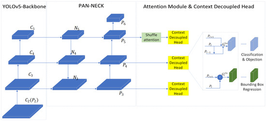Overview of the proposed method’s structure. We used the backbone of YOLOv5 and neck of PAN for the network, while the shuffle attention module and Context Decoupled Head added in this paper are in the Attention Module and Context Decoupled Head part of this figure.
