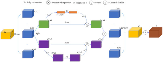 Shuffle attention achieves the grouping of features, initially, by partitioning the feature maps of a given size into G groups. Here, C indicates the total number of channels, while H signifies the vertical dimension of the feature map, and W corresponds to its horizontal dimension. Specifically, shuffle attention divides the feature maps of as G clusters, denoted as , where each is of the size . Consequently, during training, every individual component map progressively captures different interpretive insights.