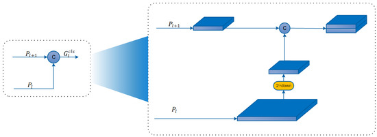 Figure 5 shows the DPE structure. The feature map on is first upsampled by a factor of 2 and then aggregated with . Subsequently, it is downsampled to the resolution of through a 3 × 3 convolutional layer with a stride of 2. Finally, is upsampled and combined to produce the final classification feature map, . The computation process is as follows:
