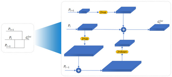 Here, (•) signifies upsampling, while DConv(•) indicates a shared convolutional layer for downsampling. Specifically, we compute using , , and . Subsequently, further bounding box predictions at the l-th pyramid level are performed through , where represents the locational loss function and represents the further bounding box regression operation.