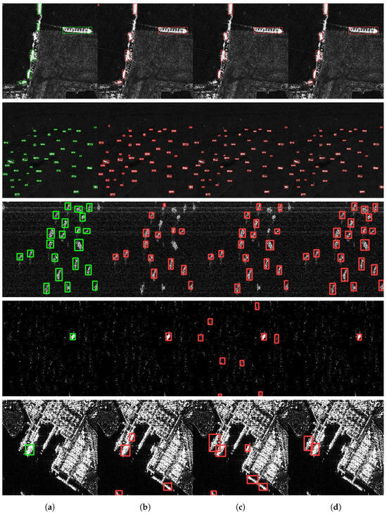 In traditional ship detection algorithms, CFAR [2,3] and other adaptive algorithms are widely utilized due to their capability of adaptively scanning images. The CFAR method analyzes input noise to establish thresholds, thereby identifying the presence of a target when the energy of the input signal surpasses these thresholds. To cater to the diverse requirements of various SAR image applications, multiple statistical models have been proposed, encompassing Gaussian, gamma, Weibull, log-normal, G0, and K distributions [4,5]. Moreover, enhancements and variations of CFAR algorithms continually emerge [6,7,8]. Nevertheless, these approaches often require the manual configuration of features, which is laborious, and exhibit limited transfer ability. While these methods excel in scenarios involving single-class ships and locally uniform background noise, their efficacy wanes in scenarios such as nearshore ship detection with intense interference, as well as multi-scale ship detection [9,10]. Additionally, they lack the capability to process targets end-to-end. Hence, there exists an imperative need for more sophisticated and robust algorithms to tackle these challenges.