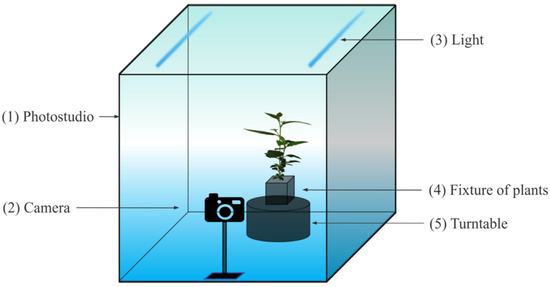 A black non-glare flannel was laid on the photo studio to create a noiseless background while mitigating reflection, in order to prevent the color distribution of the image from being affected and to optimize the accuracy. The light was adjusted to an appropriate brightness through pre-testing and remained the same during the image shooting. A plastic pot was affixed to the center of the turntable to secure the plants. The external computer was used to control the shooting, and the rotation speed of the turntable was tunable. Images were shot from a side view to acquire more comprehensive photos that accurately depicted the variations in the above-ground part. Furthermore, the shooting interval was adjusted to approximately every 25.7°, resulting in 14 images being captured in each 360°. The image resolution was 3648 × 2736 pixels, and the file format was RGB (JPEG).