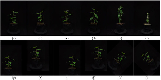 Sample images from the B. luminifera drought stress dataset (a–f) and from the moved and rotated datasets (g–l): (a) CG; (b) DR1; (c) DR2; (d) DR3; (e) DR4; (f) DR5; (g) moved down one-fifth to the left; (h) moved up one-sixth to the left; (i) moved down one-fifth to the right; (j) moved up one-sixth to the right; (k) turned 45° clockwise; (l) turned 45° counterclockwise.