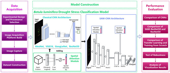Although such research has been extensively conducted on crops and vegetables, the development of research on stress identification and classification related to forests has been delayed and less fruitful [35,36,37]; thus, filling the relevant gaps in this domain during this surge of automation is considerably urgent. In addition, the self-attention mechanism [38,39] and CBAM [40,41,42] are predominantly employed in studies combining attention mechanisms and classical CNNs, while the effect of attention mechanisms across various dimensions on the network and stress identification is seldom investigated. In terms of the prominent economic and ecological value of B. luminifera in southern China, an image-based high-throughput methodology for identifying and classifying drought stress is crucial. This methodology will achieve the real-time acquisition of drought stress measures in seedlings, greatly facilitating breeding and related research. Against the backdrop described above, an innovative attempt was made to combine spatial attention modules (SAMs) with a CNN to construct a new architecture for realizing the drought stress classification of B. luminifera based on visible-light images, and the enhancement effect of the spatial attention mechanism on the network was explored.