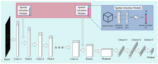 Firstly, the input feature map was convolved with two convolution kernels of different sizes. Then, the two feature maps were concatenated and processed with a multi-layer perceptron to obtain the attention weight of each pixel, in order to distinguish its importance. Finally, a new feature map was acquired by strengthening useful pixels and suppressing useless pixels. The specific calculation formula is shown in Equation (1), where σ represents the sigmoid function and f 7 × 7 represents a convolution kernel with a size of 7 × 7, as follows: