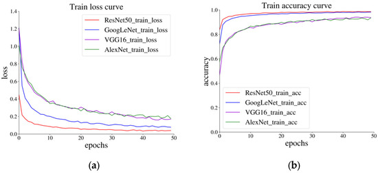 The loss function curves of the four CNN models on the training set are displayed in Figure 5a, and the accuracy curves are shown in Figure 5b. The convergence rate of the loss function of ResNet50 was the fastest, reaching near convergence after just 20 epochs, while VGG16 had the slowest convergence, taking about 45 epochs to converge. This slower rate for VGG16 was likely due to the large number of parameters in the network. AlexNet and GoogLeNet exhibited intermediate convergence rates. Furthermore, analyzing the loss function values after 50 epochs, ResNet50’s loss function stabilized between 0 and 0.1, while GoogLeNet’s value ranged between 0.1 and 0.2. In contrast, the loss function values for AlexNet and VGG16 remained above 0.2 and exhibited significant fluctuations.