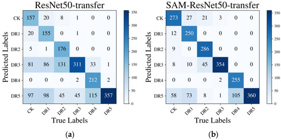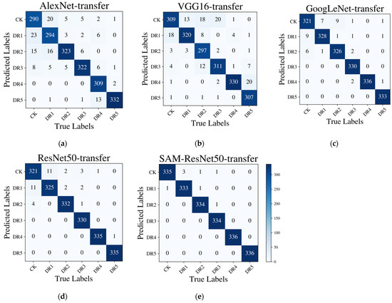 The confusion matrixes describing the results of different models: (a) AlexNet; (b) VGG16; (c) GoogLeNet; (d) ResNet50; (e) SAM-ResNet50.