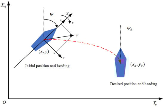 Marine autonomous vessels have garnered significant interest in recent decades because of their potent capacity for ocean exploration and exploitation [,]. As a typical unmanned intelligent platform system at sea, unmanned surface vessels (USVs) have an extensive background in marine engineering applications in both military and civilian fields, such as marine resource detection, intelligence gathering, reconnaissance and patrol [,]. Dynamic positioning (DP) stands out as a pivotal technology for the motion control of USVs. It empowers these vessels to meet diverse operational demands by utilizing their propulsion systems to counteract marine environmental challenges like wind, waves, and currents. This capability allows USVs to attain and sustain a designated position on the water’s surface or to follow a specified trajectory while maintaining a particular orientation accurately. It has the characteristics of solid maneuverability, high positioning accuracy, and low positioning cost [,,]. Nevertheless, the dynamic positioning system is highly nonlinear, multi-input, multi-output, and susceptible to external interference, so USV dynamic positioning research still faces significant challenges [,,].