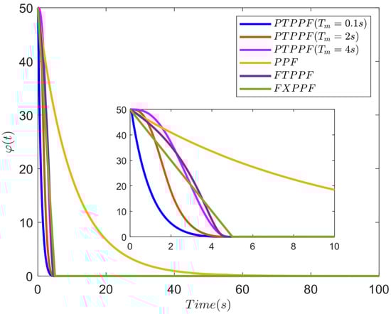 is the terminal time specified a priori by the designers according to mission requirements, and is a constant parameter with . In general, there is no unique choice for Tm, decreasing renders a faster convergence rate but an increased control effort during the time interval and vice versa. The proposed PTPPF has a more flexible shape under the same by choosing a different , which benefits the more flexible design of high-performance (steady-state and transient) controllers according to the actual requirements.
