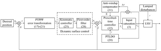 In this subsection, the prescribed-time control algorithm, disturbances observer technique, and prescribed performance theory are embedded into the dynamic surface control scheme, and a prescribed-time DP control strategy with prescribed performance constraints is put forward, which makes the positioning errors converge to specified constraints within a prescribed time with high robustness and precision. The prescribed-time DP control scheme is revealed in Figure 3.