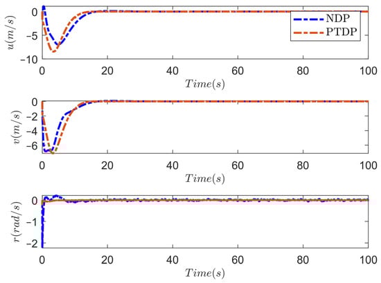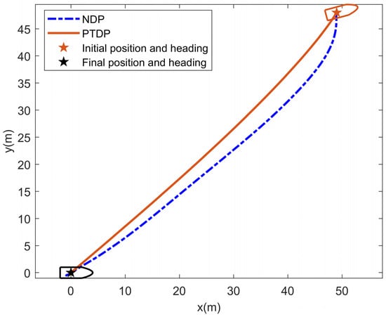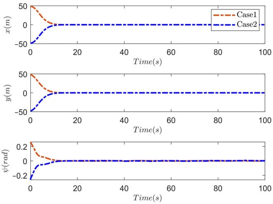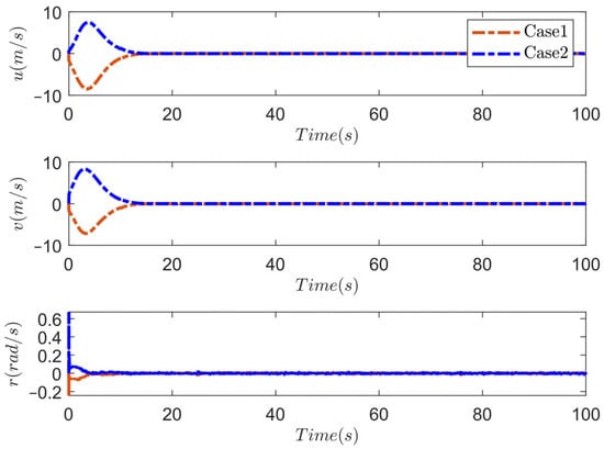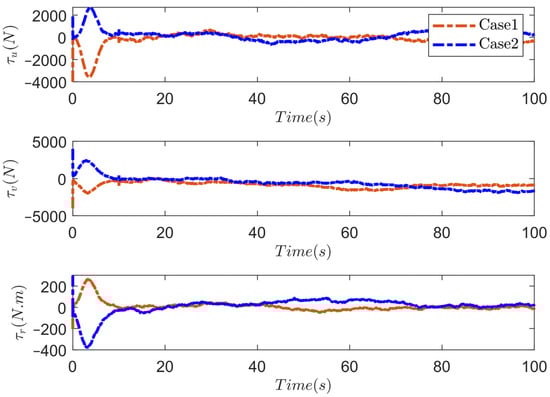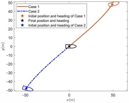 In this subsection, the simulations are carried out using the proposed PTDP control strategy under different initial states. Without loss of generality, the external marine environmental disturbances are taken as a first-order Markov process with Gaussian white noise . is the vector of bias forces and moments, is the diagonal time constant matrix, is the vector of zero-mean Gaussian white noises, and is a diagonal matrix scaling the amplitude of . We choose and . Model uncertainties are set as , . The desired position and heading are taken as . The initial states of two cases are set as follows: Case 1:; Case 2: . In the simulation, the control parameters are selected as: , , , , , , , , , , , , , , . Furthermore, the maximum force and torque provided by the propulsion in each degree of freedom are and . Figure 4, Figure 5, Figure 6, Figure 7 and Figure 8 display the outcomes of the simulation. The dynamic positioning result of two cases under the proposed prescribed-time DP control strategy is depicted in Figure 4. Apparently, due to the prescribed performance constraints and the prescribed time control law of the proposed scheme, the USV will converge from the initial position to the desired position quickly and smoothly within the prescribed time. Figure 5 shows the response curves of positions and headings during USV dynamic positioning. Figure 6 displays the velocities of two cases in dynamic positioning. The positioning error curves of two cases under the proposed DP control law are shown in Figure 7. The graph shows that the positioning error quickly and accurately approaches the predefined performance constraints within the prescribed time , and the stability time is adjustable according to the task requirements while ensuring accuracy. Figure 8 gives the control inputs of two cases under the proposed DP scheme. Under the action of the anti-windup compensator, the control input does not exceed the maximum amplitude that the thruster can provide.