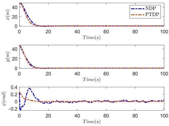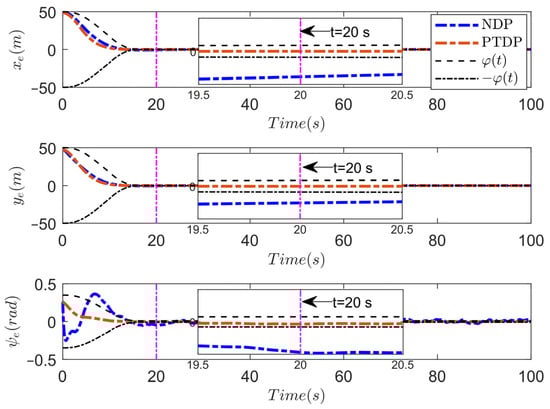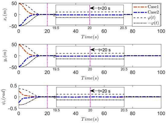 Therefore, when , , and are bounded. From the definition of , , and are also bounded. Furthermore, and are bounded, which means and are bounded. Note that since the control input is a continuous function about , , and , the control law is also bounded. Based on the above analysis, it is obvious that all signals in the closed-loop system are ultimately uniformly bounded. Meanwhile, according to inequality (10), it can be inferred that for , there exists . By selecting , one has . Combined with (6), (7), and (17), it can be seen that